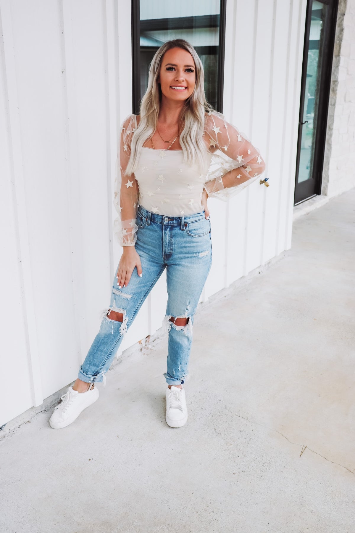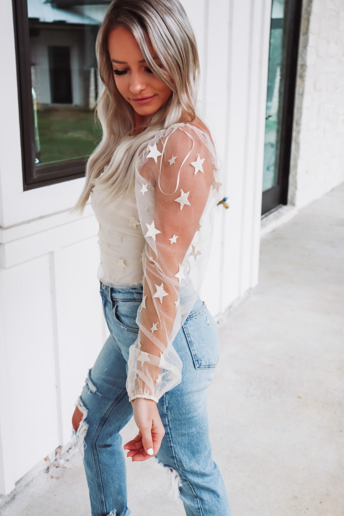 Regular price $34.00- Super trendy cream bodysuit featuring sheer sleeves with gold stars